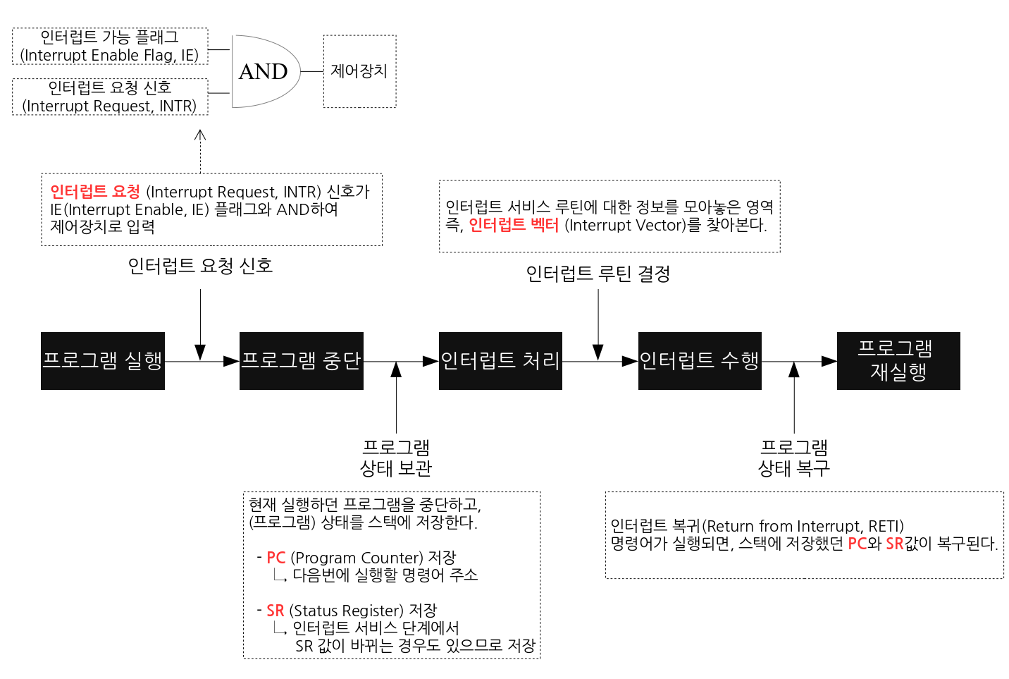 - ISR로 점프 한다. 이때 PC(Program Counter, IP) 값은 자동 대피 저장된다.
